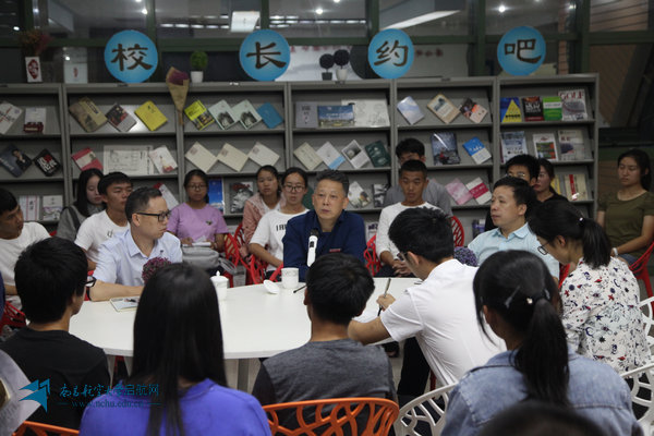 校长罗胜联,副校长何兴道,学工处、校团委负责人与新生相约“校长约吧”