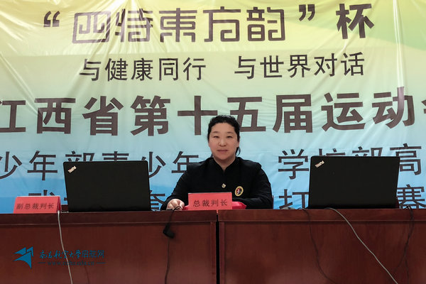 又讯 江西省第十五届运动会武术套路项目比赛在景德镇圆满结束,我校国家级武术裁判、体育学院张莉老师,担任本次比赛总裁判长并作为颁奖嘉宾为运动员颁奖。