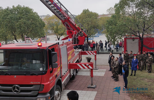 南昌市消防特勤中队出动消防水罐车、云梯车以及抢险救援车参加本次演习,并现场演示快速战斗展开灭火、火场被困救援、高空营救等项目,给参加演练的师生上了一堂生动的火场逃生课。