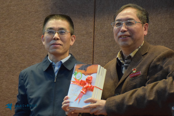 梁纯平代表活动举办方向学院赠送气象科普书籍,我校科技学院院长李建萍接受赠书。
