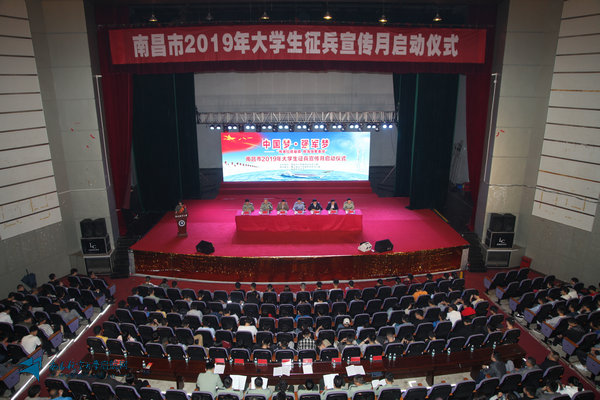 启航网讯 4月27日下午,南昌市2019年大学生征兵宣传月启动仪式在我校大学生活动中心礼堂举行。南昌市警备区司令员陆建刚、学校党委书记郭杰忠、学校党委副书记黄士安、南昌市人民政府副秘书长王耀及南昌市征兵办副主任王水生和南昌市各区县武装部主要负责人到会,我校各学院党委书记、学工办主任、辅导员和学生代表共900人参会。