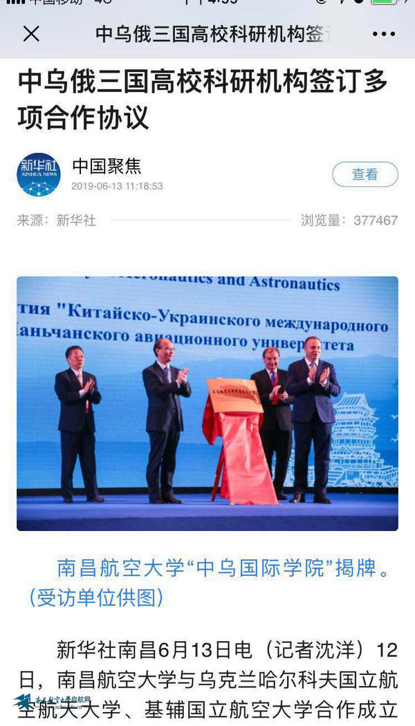 启航网讯 6月13日,新华社客户端以“中乌俄三国高校科研机构签订多项合作协议”为题报道了我校与乌克兰国立航空航天大学签署联合办学协议,并与乌克兰哈尔科夫国立航空航天大学、基辅国立航空大学合作成立“中乌国际学院”正式揭牌,有力促进两国航空产业产学研用深度合作,助力江西航空产业发展的消息。