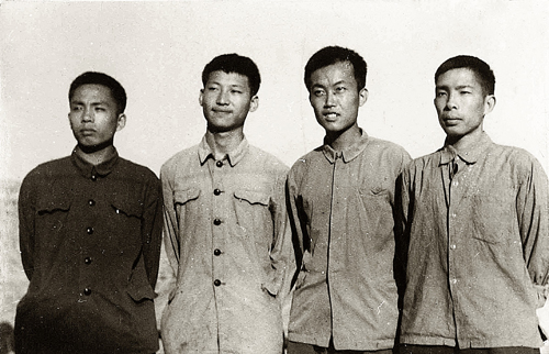 1973年,习近平和延川县北京知青雷平生(左一)、陶海粟(右二)、雷榕生(右一)在县城“三间房”前合影。图片来源:新华社 谷溪 摄
