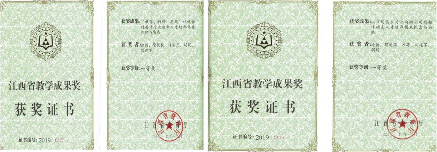 在教学改革研究方面,学院积极推进教学团队建设、教学模式改革和教学手段创新,获得“江西省高水平本科教学团队”1个;获得“江西省教学成果奖”一等奖2项;获得“江西省省级一流课程(精品课程)”5项;“外教社杯”全国高校外语教学大赛一等奖2项,二等奖2项;获得“全国翻译专业学位研究生教育改革项目”1项、“教育部产学合作协同育人项目”5项、“教育部供需对接育人项目”1项、“江西省教育教学改革研究项目”11项等;