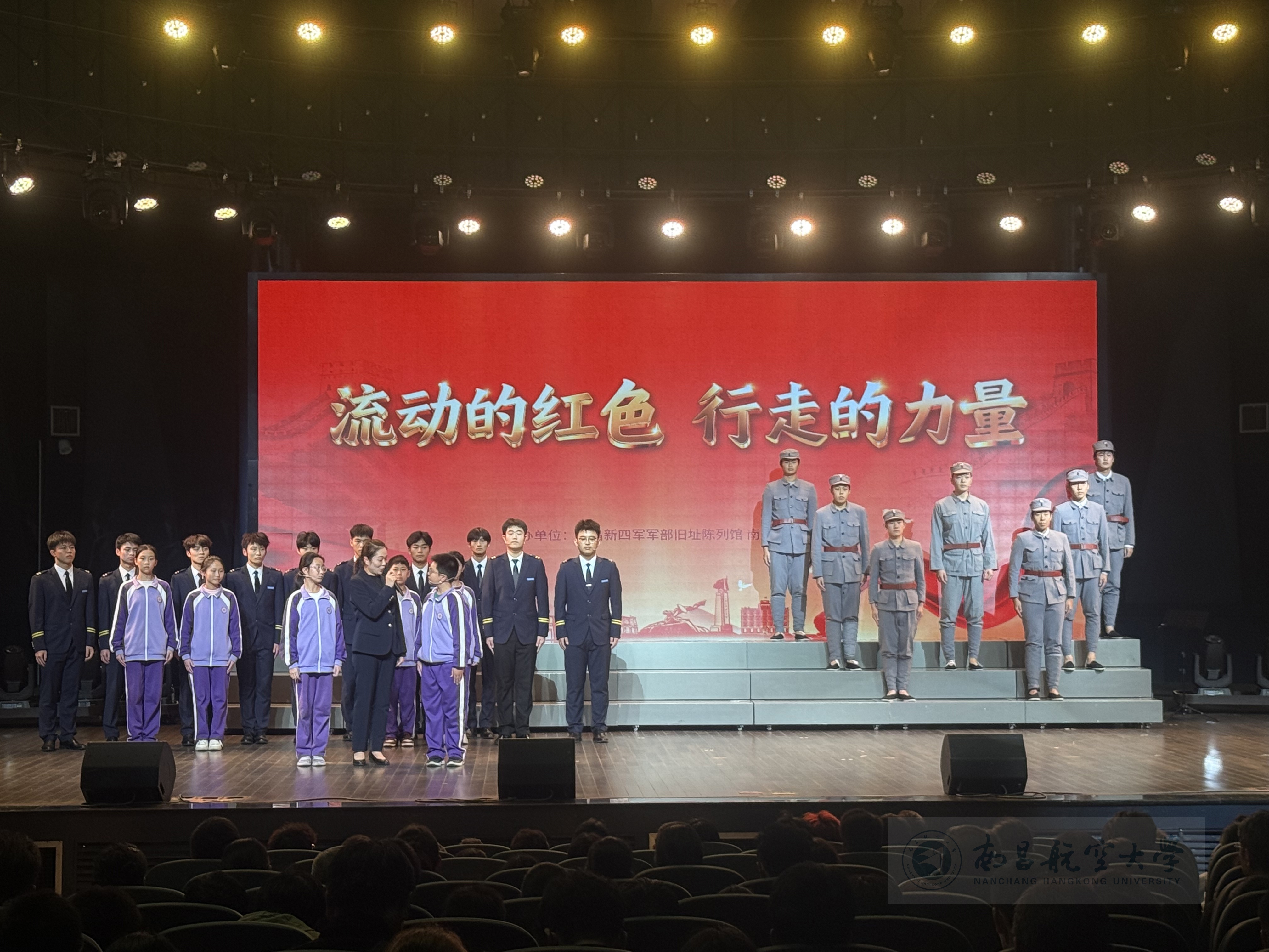 活动期间,南昌新四军军部旧址陈列馆、校团委、南昌市育新学校教育集团二七北路校区在音乐厅联合主办了一场主题宣讲,由“铁军轻骑兵”宣讲团团长、江西省新四军研究会副会长熊河水为在场师生开展题为《新四军的改编与组建》的宣讲,在宣讲过程中,展示了馆校共建设成果,由南昌新四军军部旧址陈列馆进行课程编排,我校民航学院(飞行学院)、航空服务与音乐学院同学与南昌市育新学校教育集团二七北路校区红色中队联袂演绎的情景剧大思政课《红星耀心间》《苍穹之鹰》,将历史与艺术相结合,生动再现新四军将士不屈不饶,以民族大义为重,上下一心抗战杀敌的历史,引发现场观众共鸣。