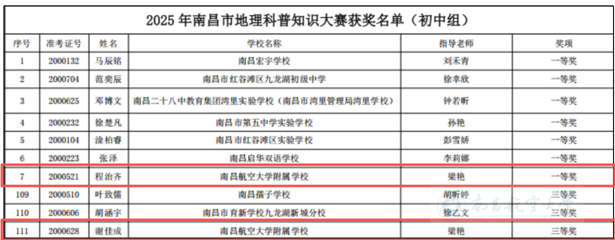启航网讯 近日,在2025年南昌市地理科普知识大赛中,附属学校学生程治齐、谢佳成两位同学凭借扎实的地理基础知识、敏锐的空间思维能力,从超100所学校,近千名参赛者中脱颖而出,分获初中组一等奖和三等奖,梁艳荣获优秀指导老师奖。