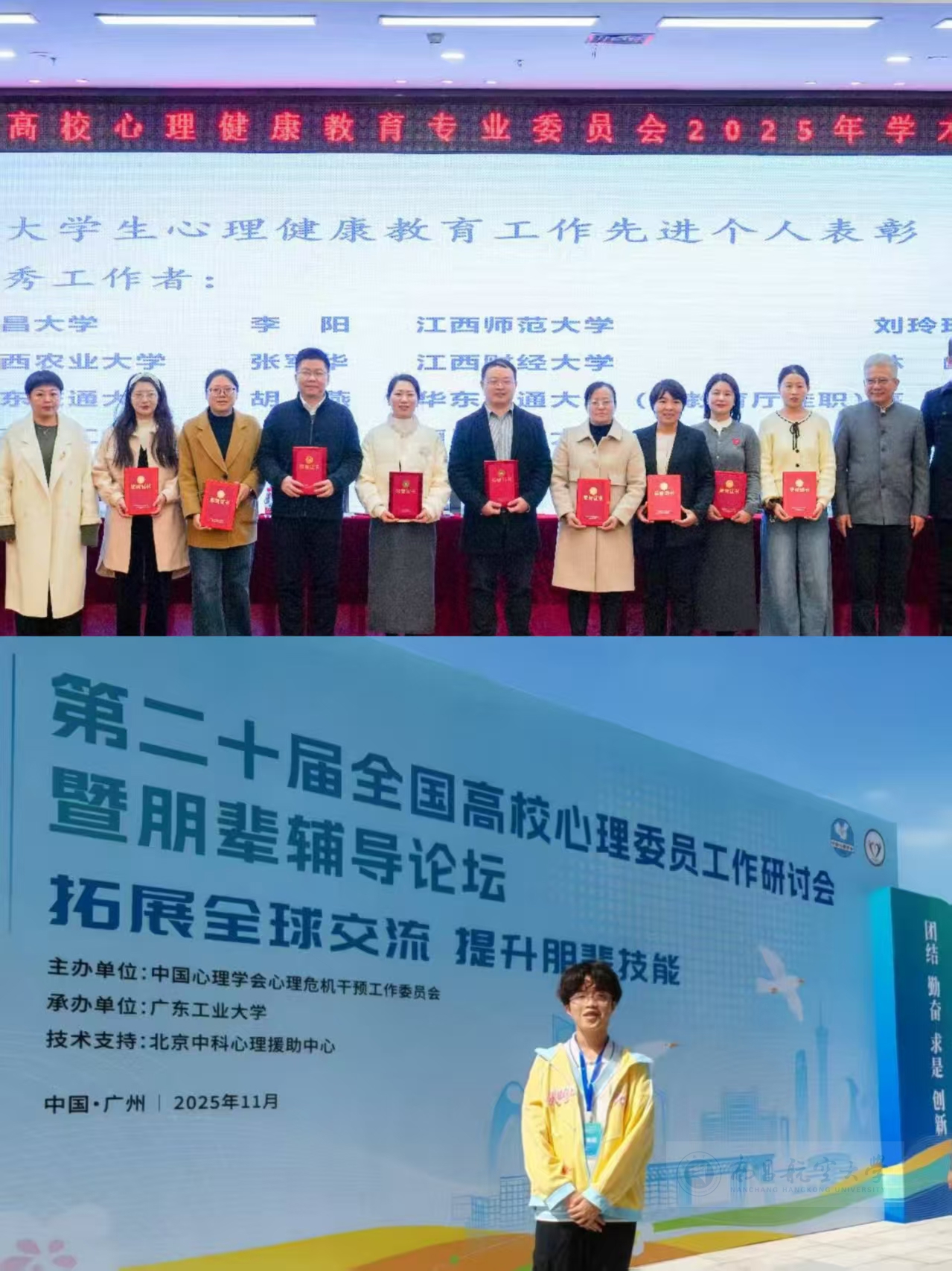 江西省“大学生心理健康教育工作先进个人”面向全省高校心理健康教育工作者展开评选,主要从教育教学、咨询服务、危机干预、活动组织及科研等维度进行综合考评;“全国百名心理委员风采展”则面向全国高校心理委员群体,侧重考察班级心理委员在信息收集、朋辈辅导、活动组织和预警转介等方面的实际表现与成效。此次师生获奖,是我校构建“全员育人、全过程育人、全方位育人”心理健康教育工作格局的具体体现,学校将持续加强心理健康教育工作队伍建设,完善心理健康教育服务体系,培育学生积极心理品质,为落实立德树人根本任务、培养德智体美劳全面发展的时代新人提供坚实保障。