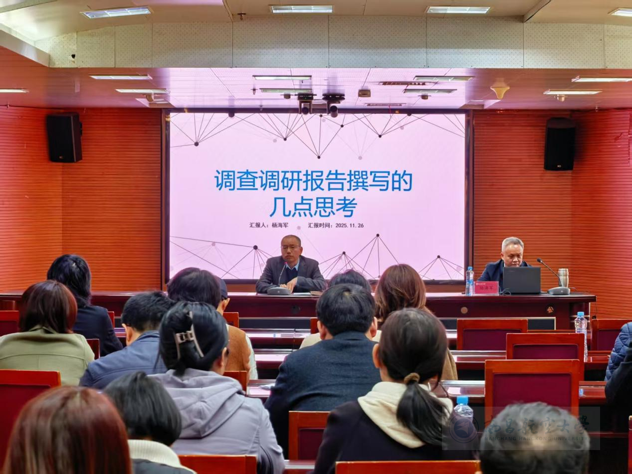 此次培训特邀民建南昌航空大学委员会副主委、民建江西省委会经济委员会常务副主任、省政协委员杨海军担任主讲嘉宾,他以“调研报告撰写的几点思考”为主题,阐述了研究报告的基本概念和功能,指出其作为决策依据的重要性;解析了如何撰写高质量的研究报告,包括选题精准、数据收集、结构逻辑和语言表达等关键技巧;分享了个人体会,强调实事求是、问题导向和持续学习在调研工作中的核心价值。通过生动案例和互动环节,杨海军将理论与实践紧密结合,参会代表纷纷表示收获颇丰,对提升自身参政议政能力具有直接指导意义。