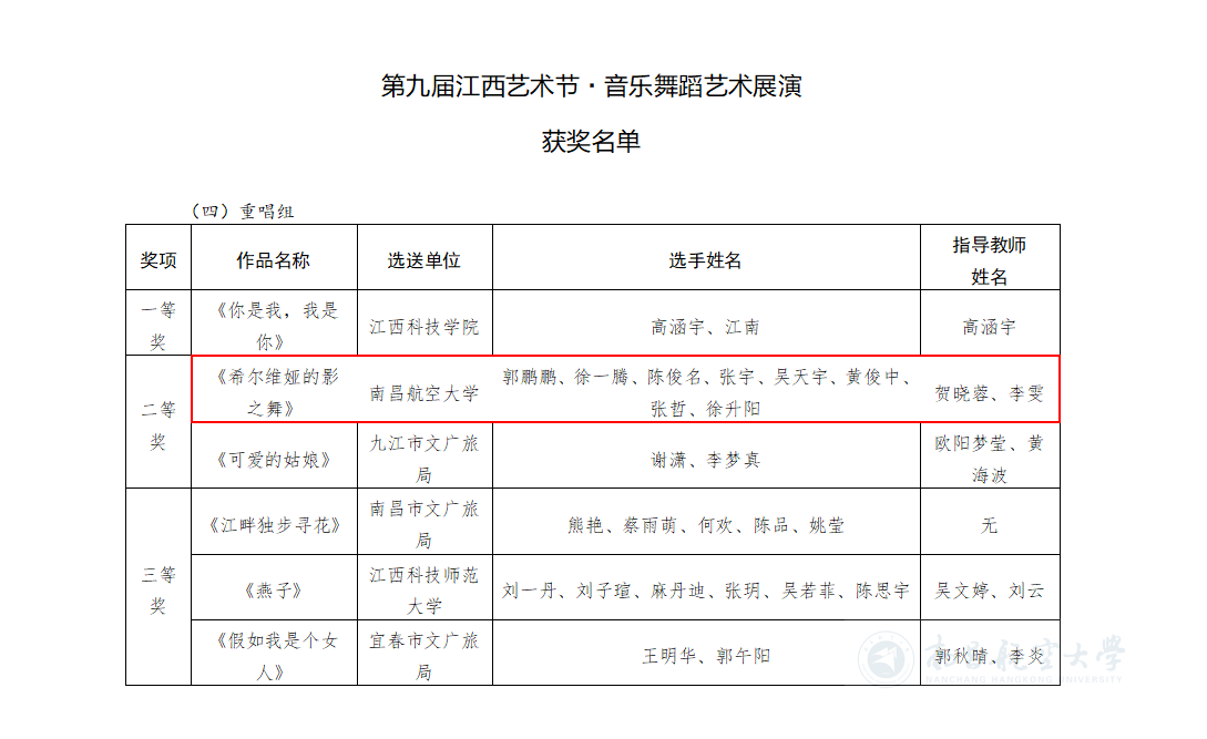 启航网讯 近日,我校航空服务与音乐学院师生在中共江西省委宣传部、江西省文化和旅游厅主办的第九届江西艺术节·音乐舞蹈艺术展演中喜获佳绩。由学院贺晓蓉副教授、李雯老师指导的节目《希尔维亚的影之舞》斩获声乐展演重唱组全省第二名(二等奖)的优异成绩!