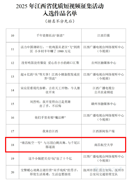 启航网讯 近日,由中共江西省委宣传部主办、江西省融媒体推进中心承办的2025年江西省优质短视频征集活动入选作品名单揭晓,我校的《“南昌航空一号”与万羽白鹤共舞,与千尾江豚逐浪》成功入选“正能量爆款精品短视频”,为全省高校唯一入选作品。