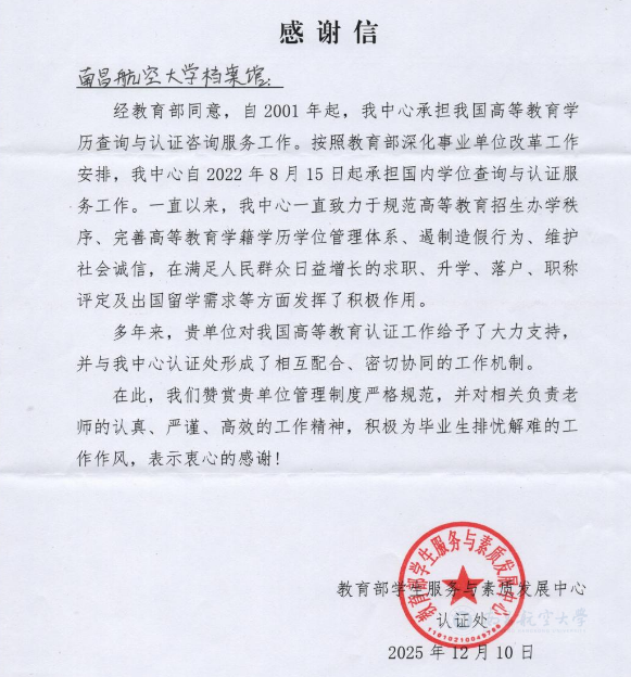 启航网讯 近日,教育部学生服务与素质发展中心向我校发来感谢信,对学校档案馆在高等教育学历学位认证工作中给予的长期支持与紧密协作,致以诚挚的谢意。