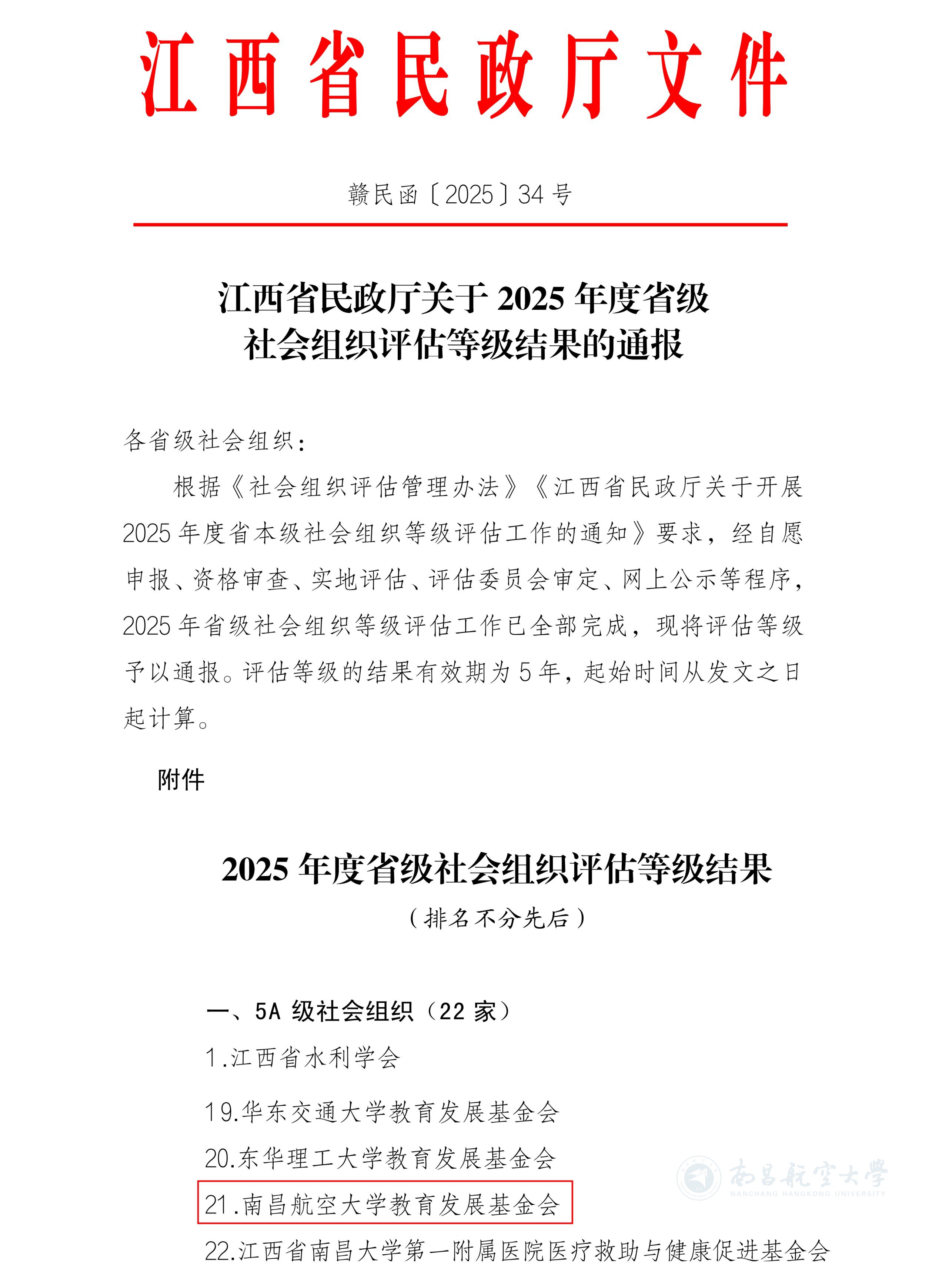 启航网讯 近日,江西省社会组织管理局发布2025年度省管社会组织评估省级结果,我校教育发展基金会再次获评江西省5A级社会组织。