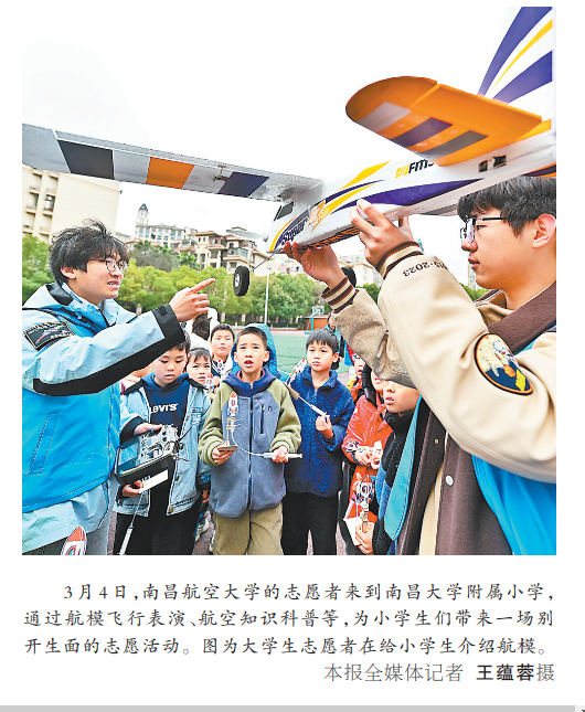 中国教育报-中国教育新闻网讯(通讯员 舒越 记者 甘甜)“哇!快看!”3月4日,在江西南昌市南昌大学附属小学前湖分校校园,南昌航空大学志愿者带来的航模表演吸引了不少学生围观。在第62个学雷锋纪念日来临之际,这群大学生志愿者通过航模飞行表演、航空知识科普等,为小学生们开展了一场别开生面的志愿活动。