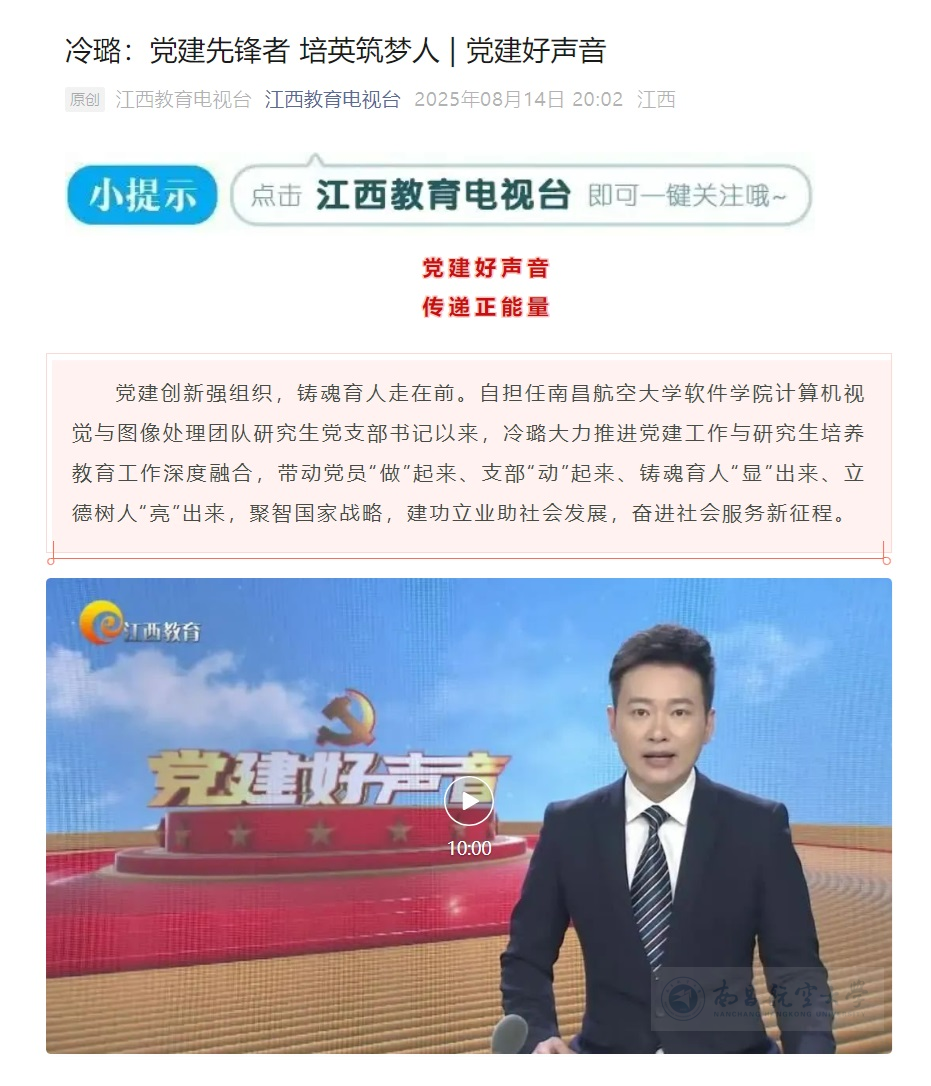您的位置: 首页 >新闻中心>媒体南航>详细内容 媒体南航 【江西教育电视台】冷璐:党建先锋者 培英筑梦人 来源: 作者: 摄影: 发布时间:2025-08-18 浏览次数: 次 【字体:小 大】 启航网讯 8月14日,江西教育电视台以《冷璐:党建先锋者 培英筑梦人》为题,报道我校“新时代赣鄱先锋”冷璐教授的先进事迹。 媒体链接:江西教育电视台:https://mp.weixin.qq.com/s/xM5OX8KSDERpA936jj6-SA 责任编辑:李政纲 相关内容 【打印正文】