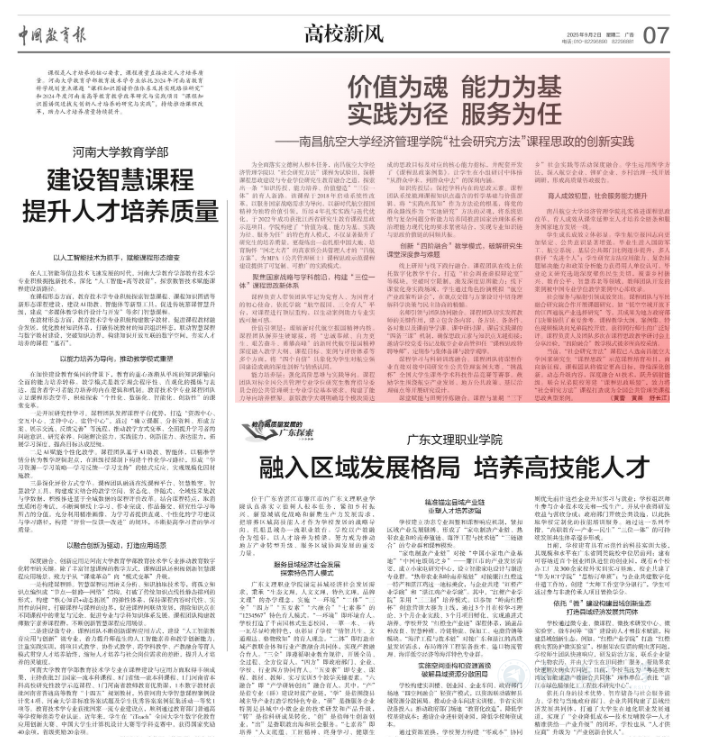 您的位置: 首页 >新闻中心>媒体南航>详细内容 媒体南航 【中国教育报】价值为魂 能力为基 实践为径 服务为任 来源: 作者: 摄影: 发布时间:2025-09-03 浏览次数: 次 【字体:小 大】 启航网讯 中国教育报 07版高校新风以“价值为魂 能力为基 实践为径 服务为任——南昌航空大学经济管理学院“社会研究方法”课程思政的创新实践”报道我校。媒体链接:https://share.app3.jyb.cn/paper_d/1b642182d4c7f17f9c4ad52736a8757c?from=VjZDc29lWmRlREZnUWRtcXVVam1CR1FZalVWa1M0V284ZDRqd0VDUVZZd0hEY3dNaExKbmVETjhjNUluVGtJWg== 责任编辑:李梦遥 相关内容 【打印正文】