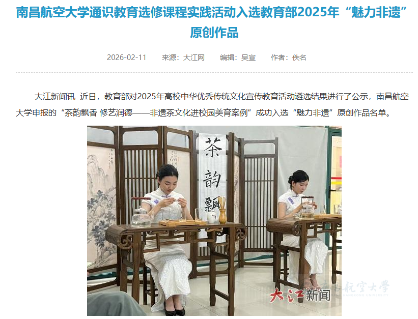 启航网讯 近日,教育部对2025年高校中华优秀传统文化宣传教育活动遴选结果进行了公示,南昌航空大学申报的“茶韵飘香 修艺润德——非遗茶文化进校园美育案例”成功入选“魅力非遗”原创作品名单。多家媒体对此进行报道。