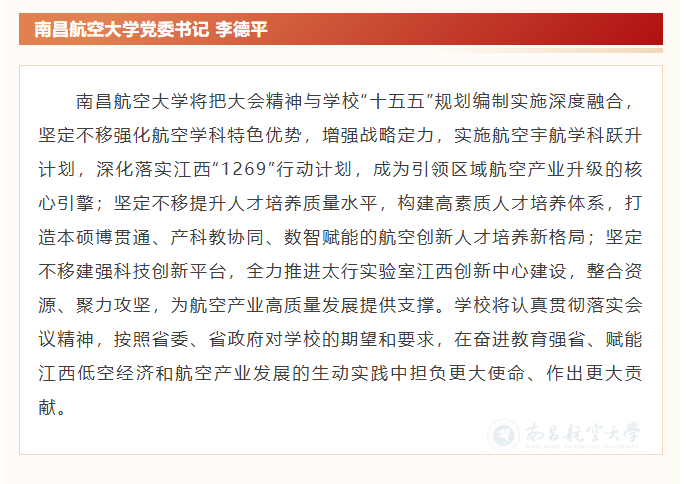南昌航空大学将把大会精神与学校“十五五”规划编制实施深度融合,坚定不移强化航空学科特色优势,增强战略定力,实施航空宇航学科跃升计划,深化落实江西“1269”行动计划,成为引领区域航空产业升级的核心引擎;坚定不移提升人才培养质量水平,构建高素质人才培养体系,打造本硕博贯通、产科教协同、数智赋能的航空创新人才培养新格局;坚定不移建强科技创新平台,全力推进太行实验室江西创新中心建设,整合资源、聚力攻坚,为航空产业高质量发展提供支撑。学校将认真贯彻落实会议精神,按照省委、省政府对学校的期望和要求,在奋进教育强省、赋能江西低空经济和航空产业发展的生动实践中担负更大使命、作出更大贡献。