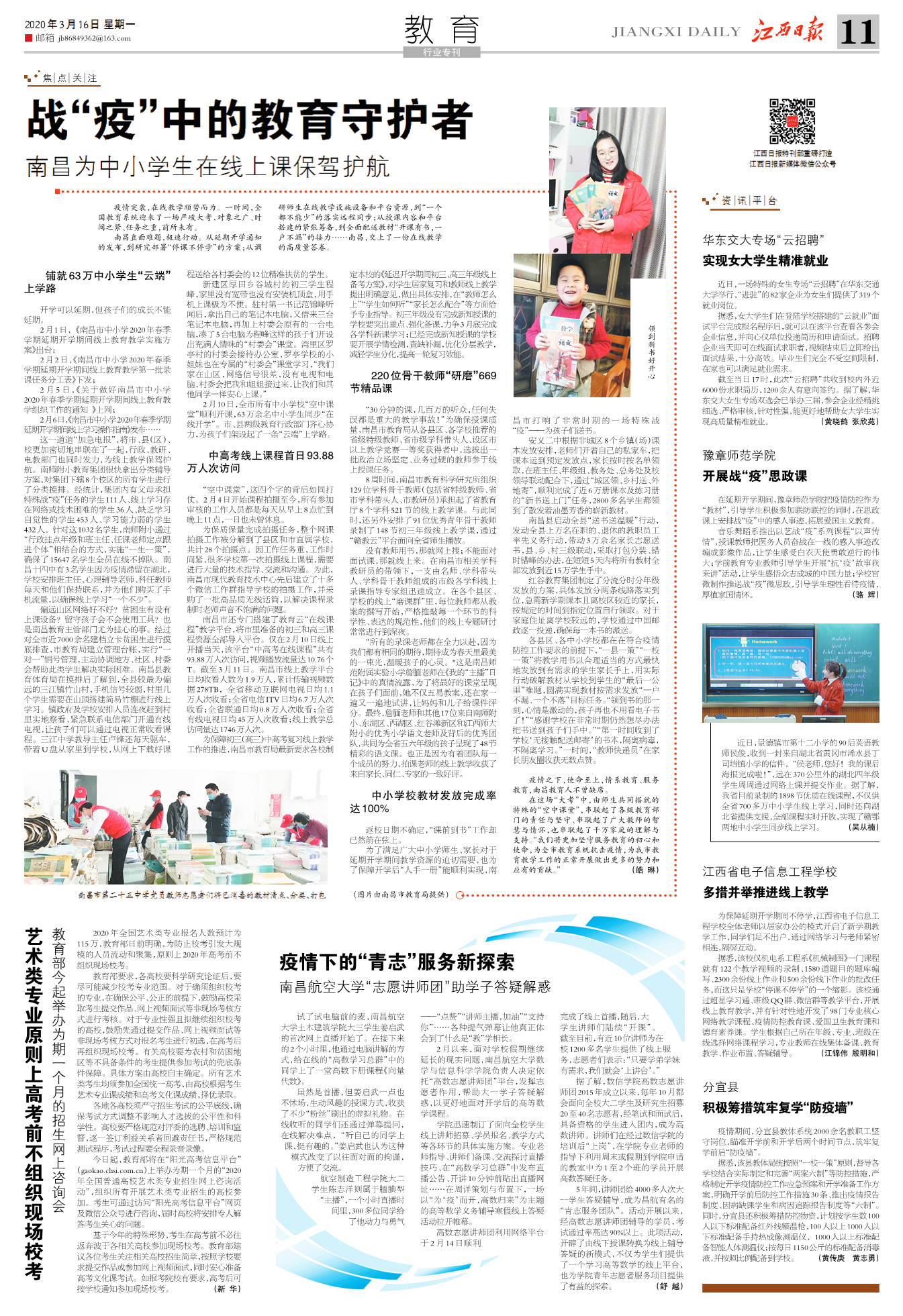 您的位置: 首页 >新闻中心>媒体南航>详细内容 媒体南航 《江西日报》报道我校“志愿讲师团”助学子答疑解惑的消息 来源: 作者: 摄影: 发布时间:2020-03-16 浏览次数: 次 【字体:小 大】 启航网讯 3月16日,《江西日报》11版教育报道我校“志愿讲师团”助学子答疑解惑的消息。 媒体链接:http://epaper.jxwmw.cn/html/2020-03/16/content_5413_2433930.htm 【打印正文】