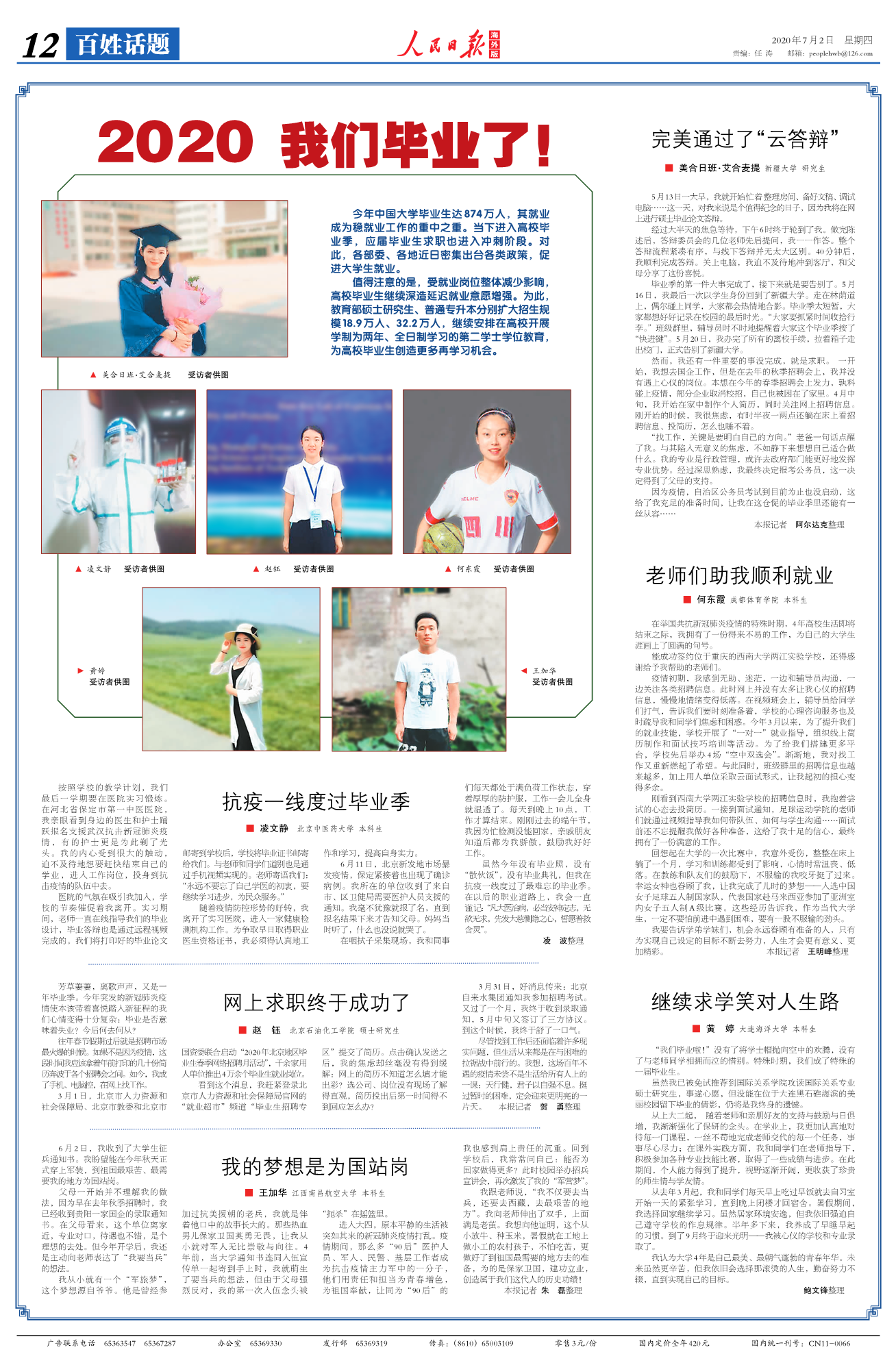 您的位置: 首页 >新闻中心>媒体南航>详细内容 媒体南航 《人民日报》报纸·海外版:2020我们毕业了!(我的梦想是为国站岗——南昌航空大学王加华) 来源: 作者: 摄影: 发布时间:2020-07-02 浏览次数: 次 【字体:小 大】 启航网讯 7月2日,《人民日报》海外版12版百姓话题报道2020毕业季我校毕业生王加华接受人民日报专访的消息。 媒体链接:http://paper.people.com.cn/rmrbhwb/html/2020-07/02/node_876.htm 【打印正文】