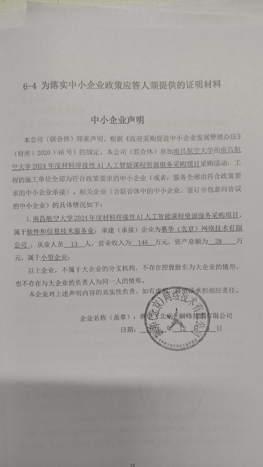 南昌航空大学2024年度材料焊接性AI人工智能课程资源服务采购项目